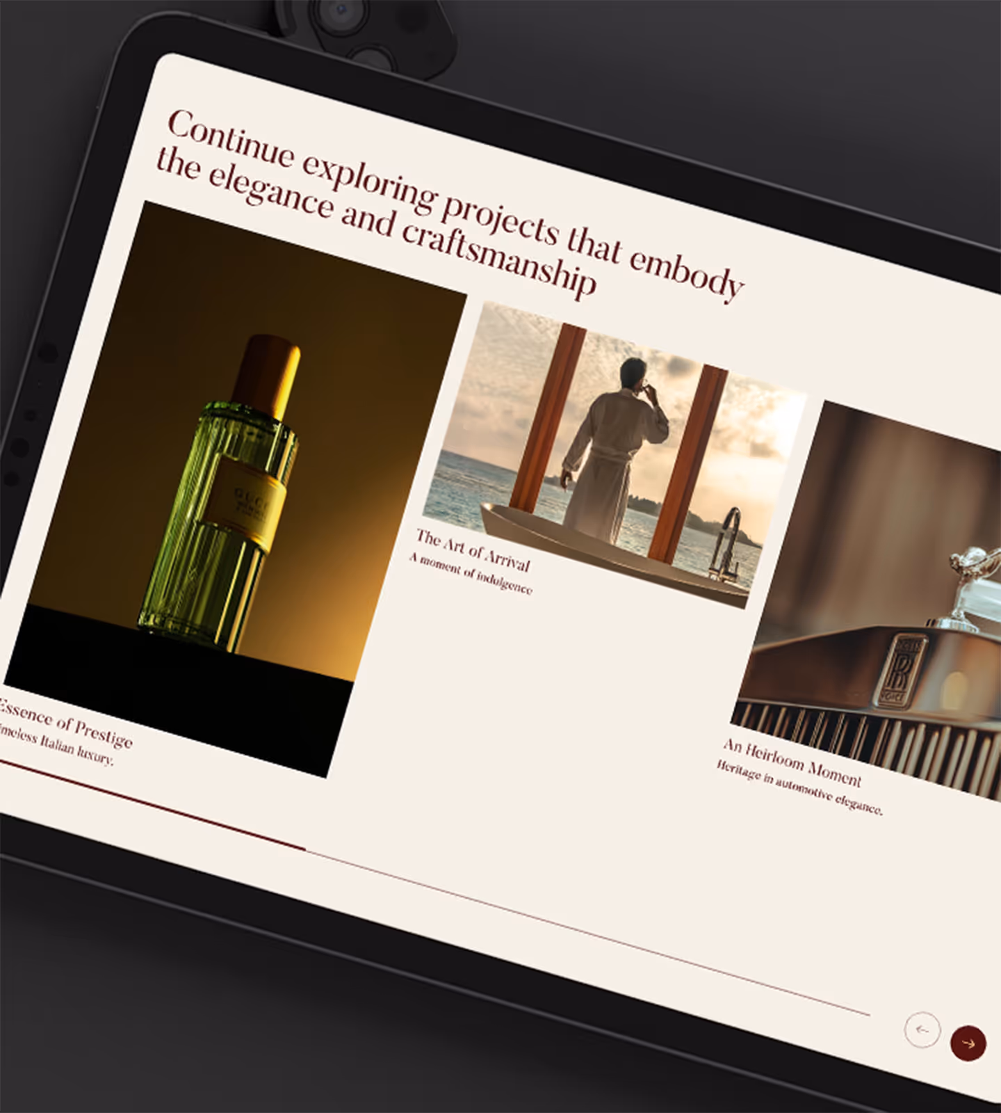 I designed a responsive digital experience across desktop, tablet, and mobile, extending the brand’s blend of warm and earth-toned palette with a highly contrasted, elegant serif typeface. The layout draws on editorial principles through generous white space, large typographic titles, and a balance of 1:1 and 16:9 imagery. A subtle blur treatment on hover isolates the active element, guiding the users attention exactly where it needs to be while reinforcing the brand’s refined visual language.